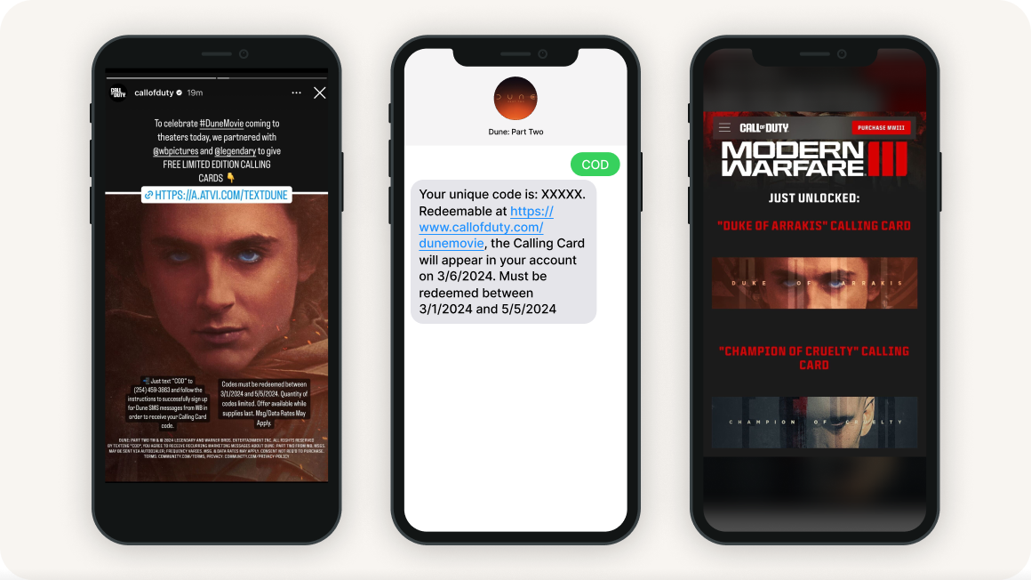 Warner Bros Pictures, Legendary Entertainment and Call of Duty partnered with Community to support Dune: Part Two and the movie-themed packs available on Call of Duty Modern Warfare. A reward for Call of Duty fans, the Dune: Part Two themed Calling Cards for the “Duke of Arrakis” and “Champion of Cruelty,” were offered as unique codes for fulfillment via a text message to the Dune: Part Two number. Launched on March 1, 2024, and in celebration of the film’s opening day, Call of Duty announced on their social handles, encouraging fans to text the keyword and join the Dune Community.