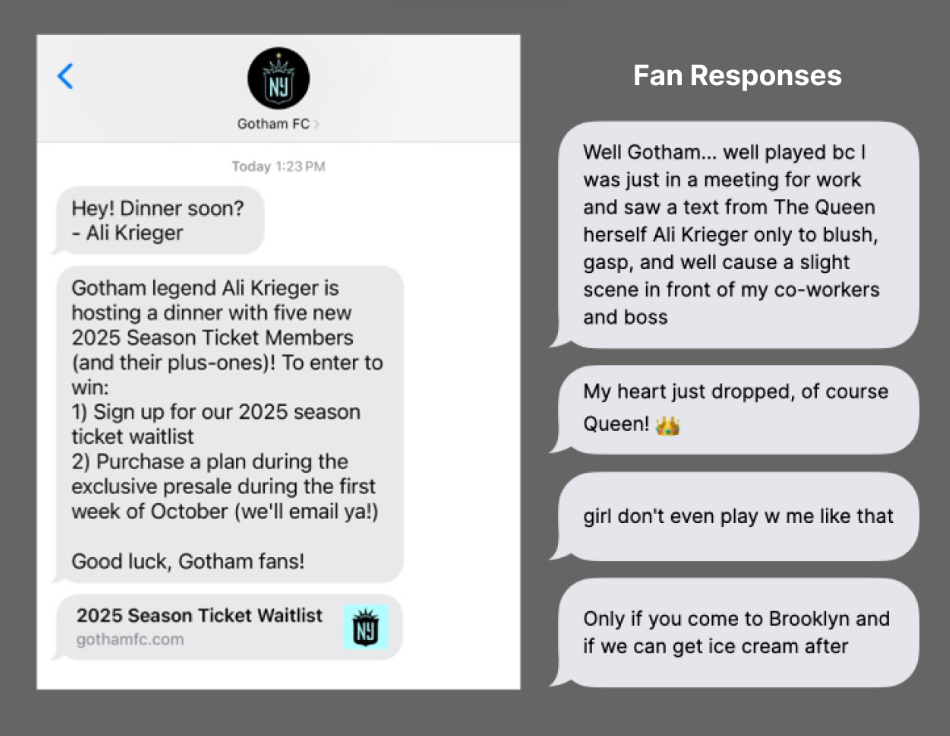 "We used Community to promote our 'Win a Dinner with Ali Krieger giveaway' and it unlockedengagement that goes beyond the typical response rate we get from organic channels likeemail. This text campaign allowed us to actually have 1-1 conversations with our fans, which isusually something we can only get inside the stadium! Ultimately, we were able to generatetens of thousands of dollars worth of season ticket leads (in just one day!), plus we were ableto identify which fans connect deeply with opportunities for player interactions, which allowsus to further segment our audience based on key purchasing drivers."