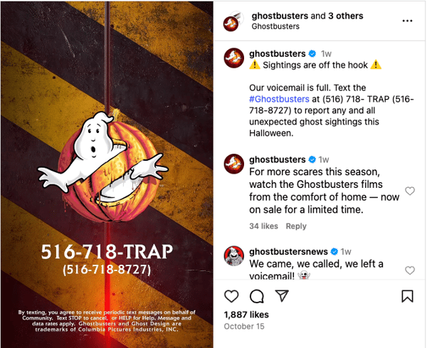 Ghostbusters (516-718-8727) shared their number on social media, inviting fans to call in and report ghost sightings ahead of Halloween. An in-world, fan-driven experience that blurred the line between fiction and reality, pulling fans straight into the storyline.