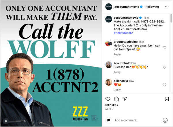 The Accountant 2 (878-222-8682) sequel with Ben Affleck and Jon Bernthal, utilized a unique in-world voice and SMS campaign to engage fans and build anticipation for its 2025 release. The film saw massive fan engagement and ultimately delivered an impressive $103.2 million at the global box office, later becoming Amazon MGM’s second most-watched title of all time.