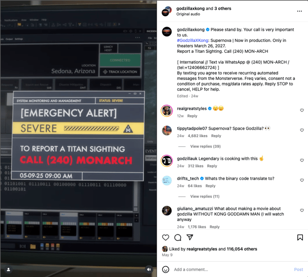 Godzilla X Kong: Supernova (240-MON-ARCH) by Monsterverse called on fans to report Titan sightings by dialing its number. This immersive campaign was set to create early buzz and fan engagement, building anticipation well ahead of the film’s release.