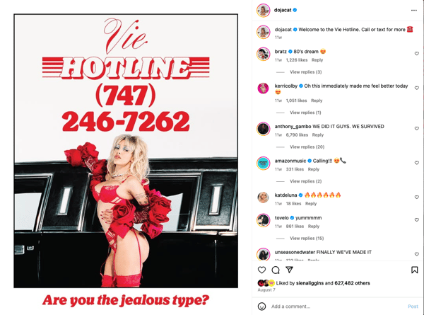 Doja Cat (747-246-7262) launched the Vie Hotline ahead of her "Jealous Type" release, inviting fans to call in and explore a custom, branching voicemail experience. The hotline delivered on-brand relationship advice that hinted at the theme of her upcoming album. Along the way, fans unlocked links to new singles, music videos, and a limited-edition autographed vinyl, keeping her most loyal fans looped in and hyped up.