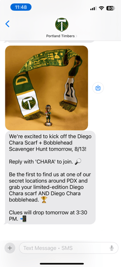 - Scavenger Hunt: Ahead of home games, fans signed up to receive text clues leading to hidden locations and exclusive prizes. One standout activation, the Diego Chara scarf and bobblehead giveaway, drove over 500 new text members and a 28% response rate.