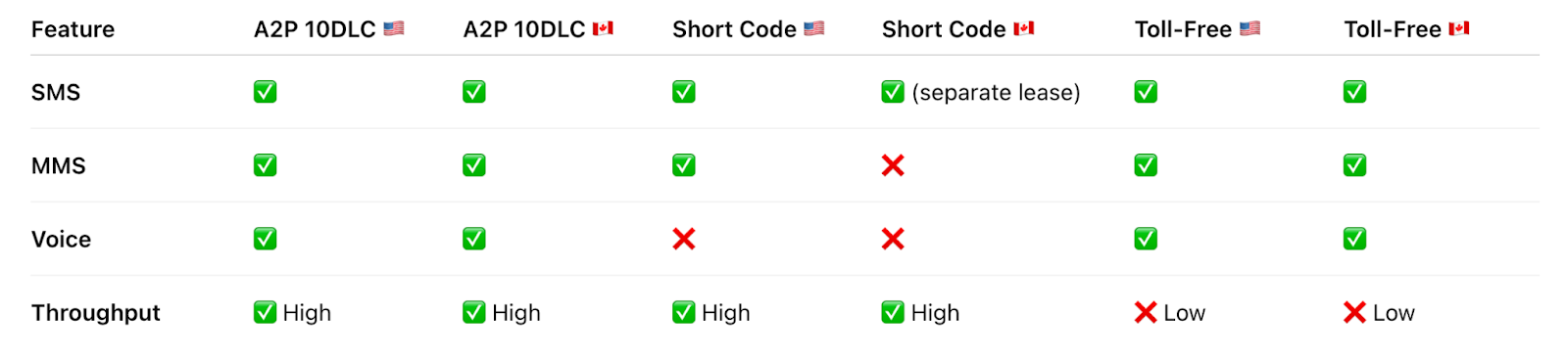Toll-free numbers support SMS, MMS, and voice across both countries, but are limited by significantly lower throughput.